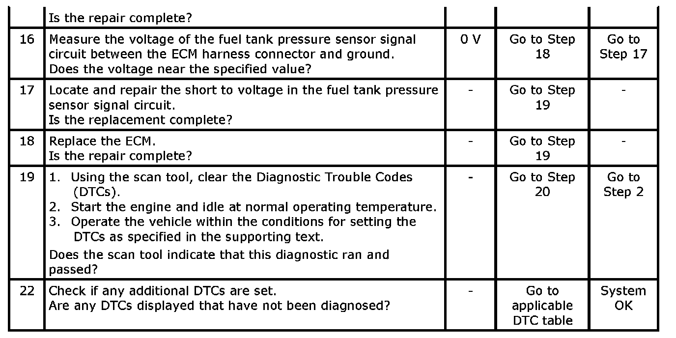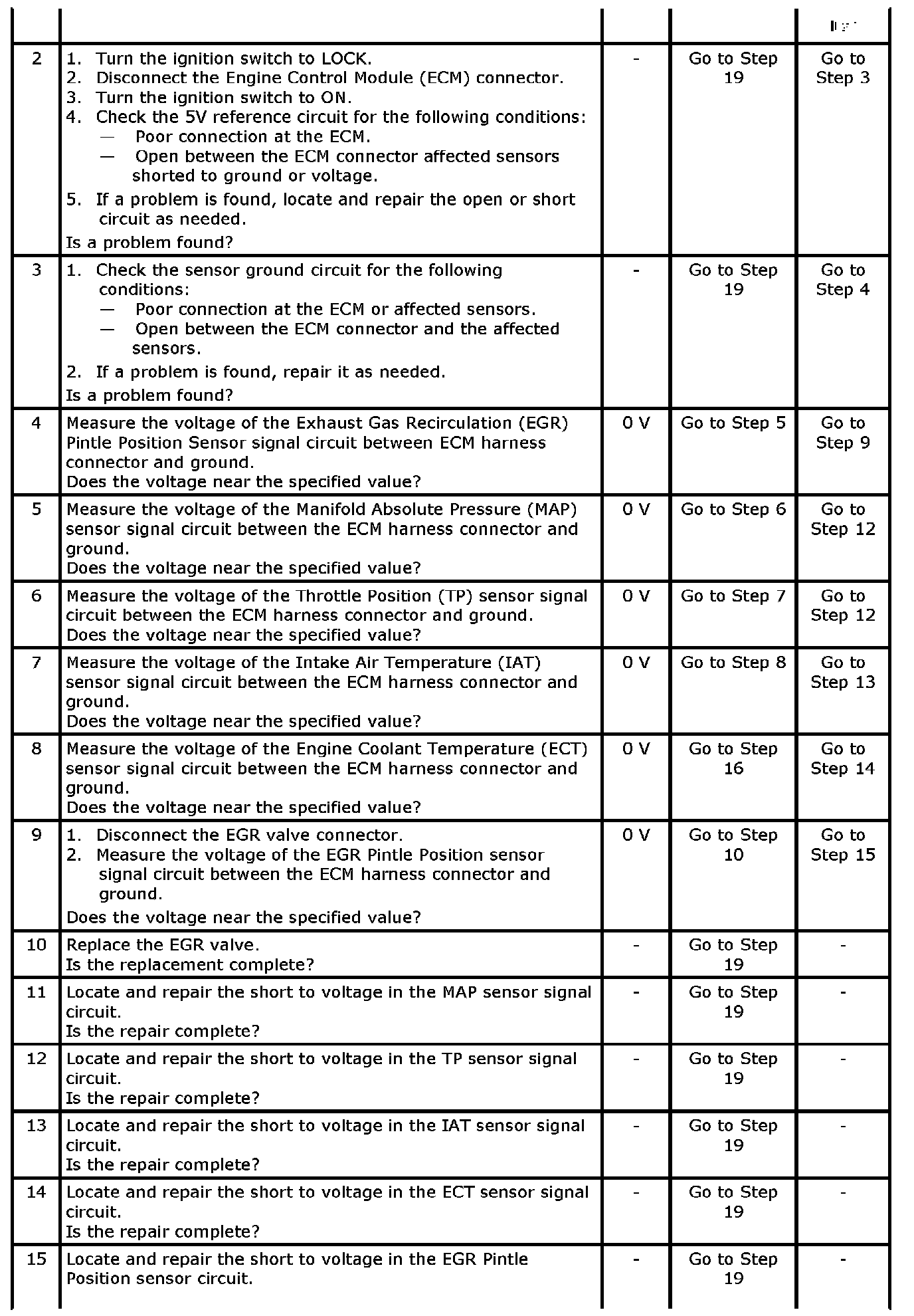 11. If a sensor input circuit has been shorted to voltage, ensure that the sensor has not been damaged. A damaged IAT or ECT sensor will continue to indicate a high voltage or low temperature after the affected circuit has been repaired. A damaged ACT, TP, MAP, Fuel Tank Pressure, or EGR Pintle Position sensor will indicate a high or low voltage or may be stuck at a fixed value after the affected circuit has been repaired. If the sensor has been damaged, replace it.