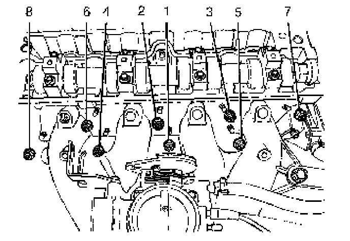 Install the intake manifold retaining nuts and retaining bolt in the sequence shown.