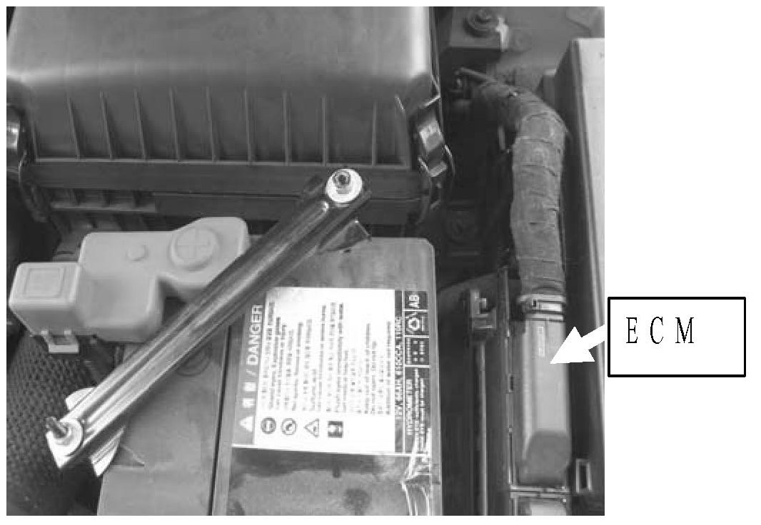 3. Disconnect the negative battery cable. Loosen the nut to remove the battery hold down "J" bolt nearest the ECM.