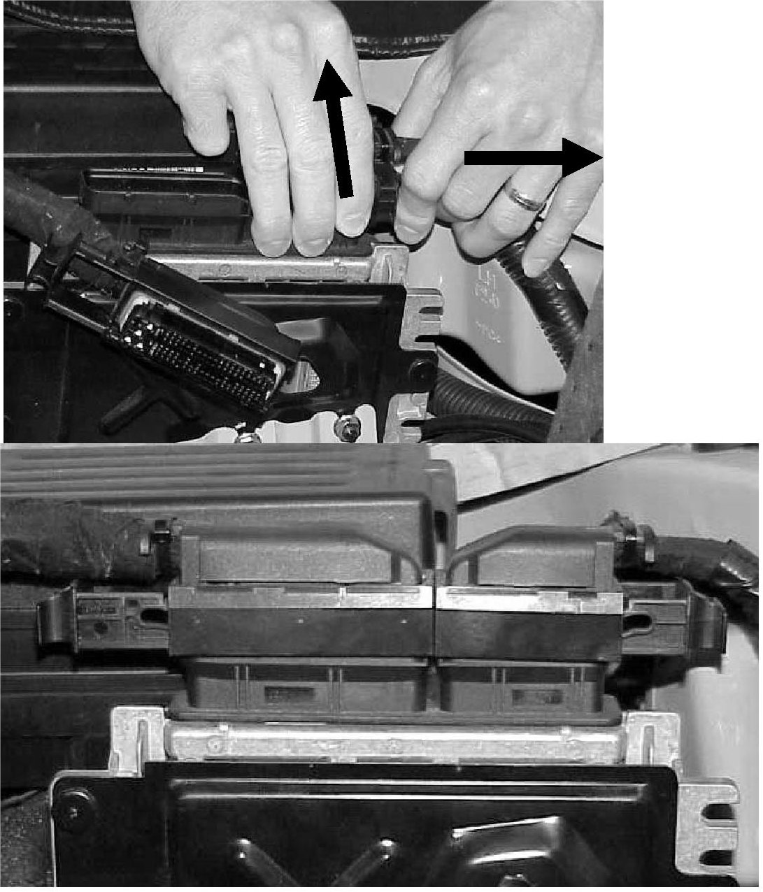 7. Reconnect the ECM connectors by pushing down while pushing the clips in until they are fully engaged.