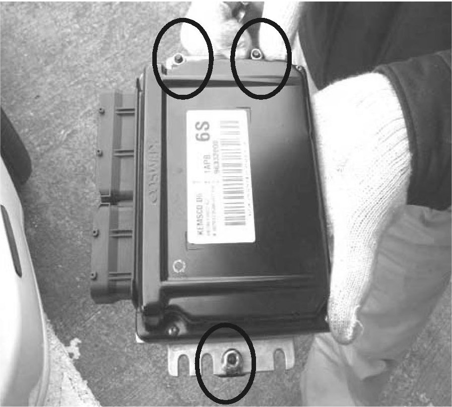6. Remove the nuts and retainer from the old ECM and install them on the new ECM.