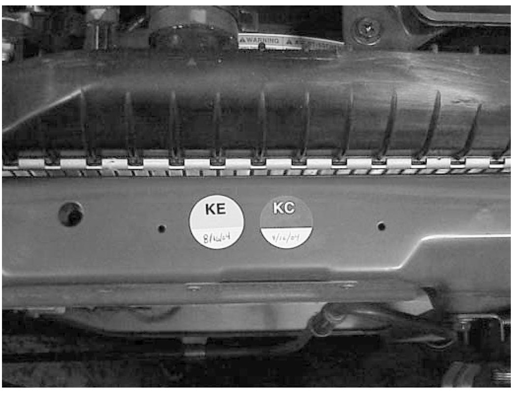 When the KE Recall is completed, check the vehicle to see if the vehicle is included in the KC Recall and whether the KC Recall has already been completed. If the KC Recall has not been completed be sure to affix both the KE and KC completion stickers to the radiator support as shown below. For California vehicles be sure to provide the customer with a Proof of Correction certification as explained in the KC Emission Recall Bulletin No. SC-24.