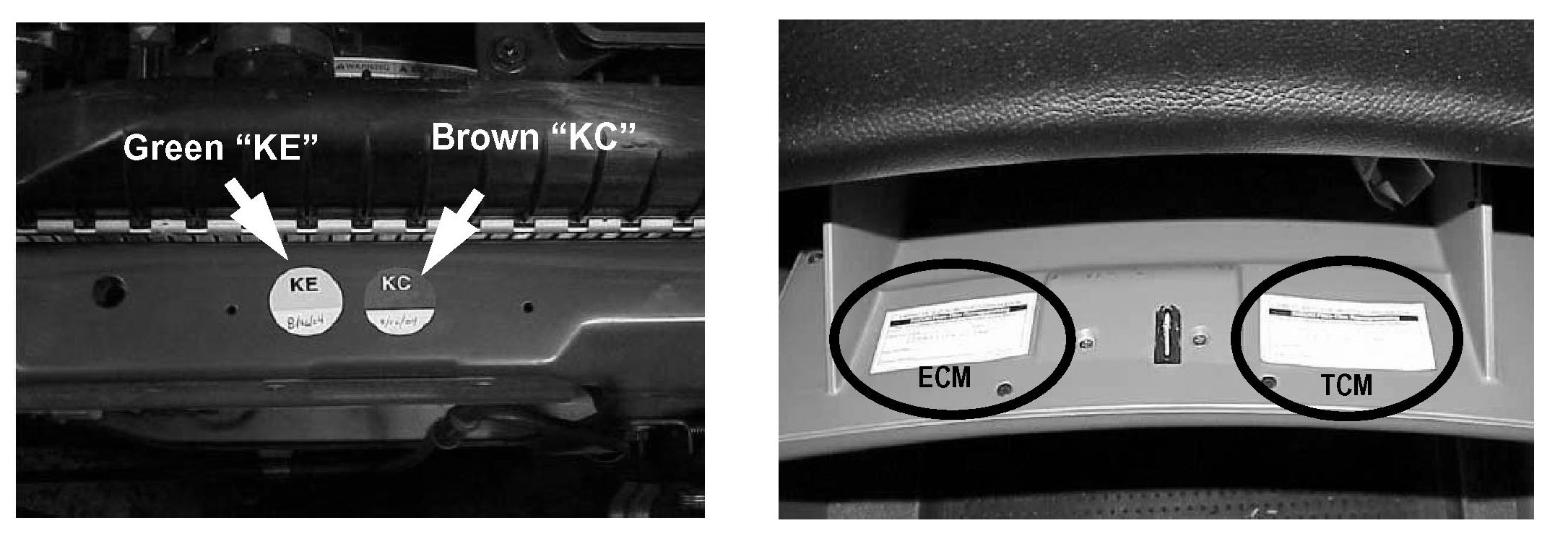 When the KE Recall is completed, check the vehicle to see if the vehicle is included in the KC Recall and whether the KC Recall has already been completed. If the KC Recall has not been completed be sure to affix both the KE and KC completion stickers to the radiator support as shown below. For California vehicles be sure to provide the customer with a Proof of Correction certification as explained in the KC Emission Recall Bulletin No. SC-24.