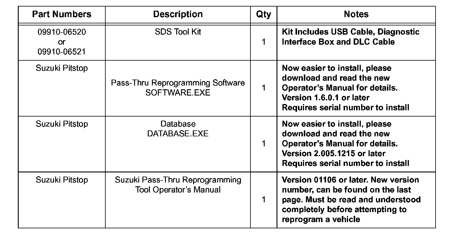 3. Following the procedure outlined in the Suzuki Pass-Thru Reprogramming Tool Operator's Manual, download and install the Pass-Thru Reprogramming Software "SOFTWARE.EXE" if it is not already installed.