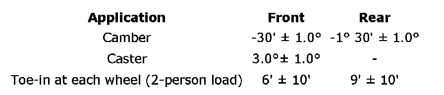 NOTE: The above alignment specifications are with the vehicle in a normally loaded condition. Prior to inspection or alignment, place a weight of approximately 150 lbs. (68 kg) on each front seat cushion.