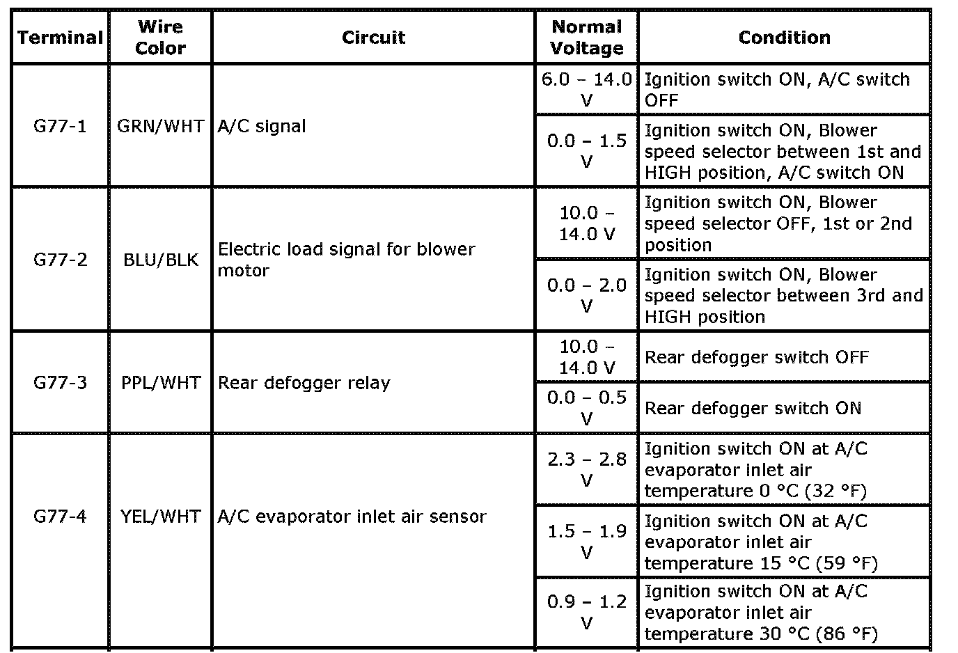 NOTE: As each terminal voltage is affected by the battery voltage, confirm that it is 11 V or more when ignition switch is ON.