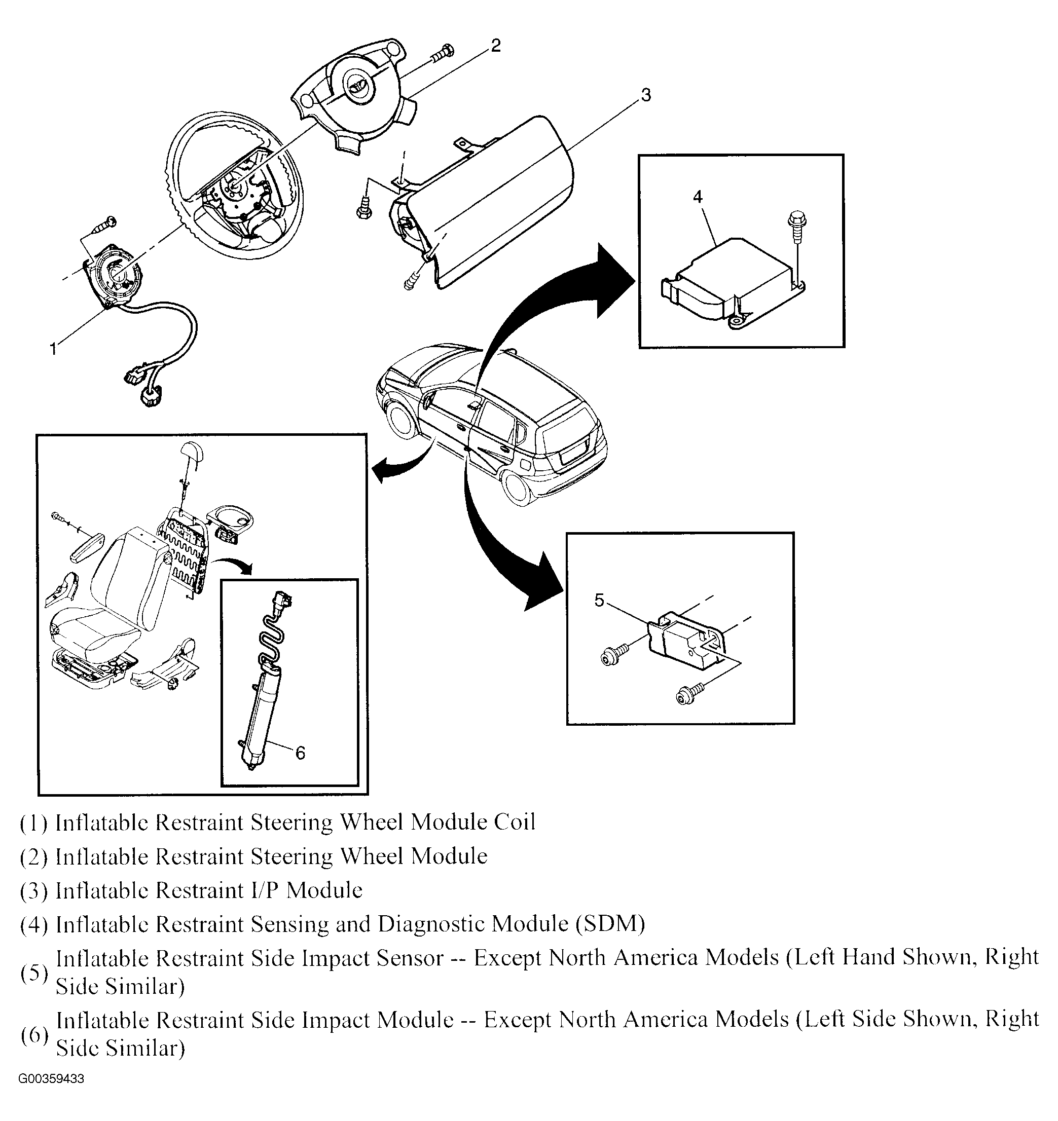 | Inflatable Restraint Sensing & Diagnostic Module (SDM) | Below center console. See Figure. |