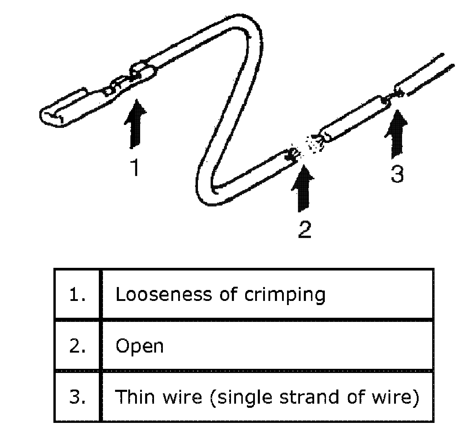 Possible causes for the open circuit are as follows. As the cause is in the connector or terminal in many cases, they need to be checked particularly carefully.