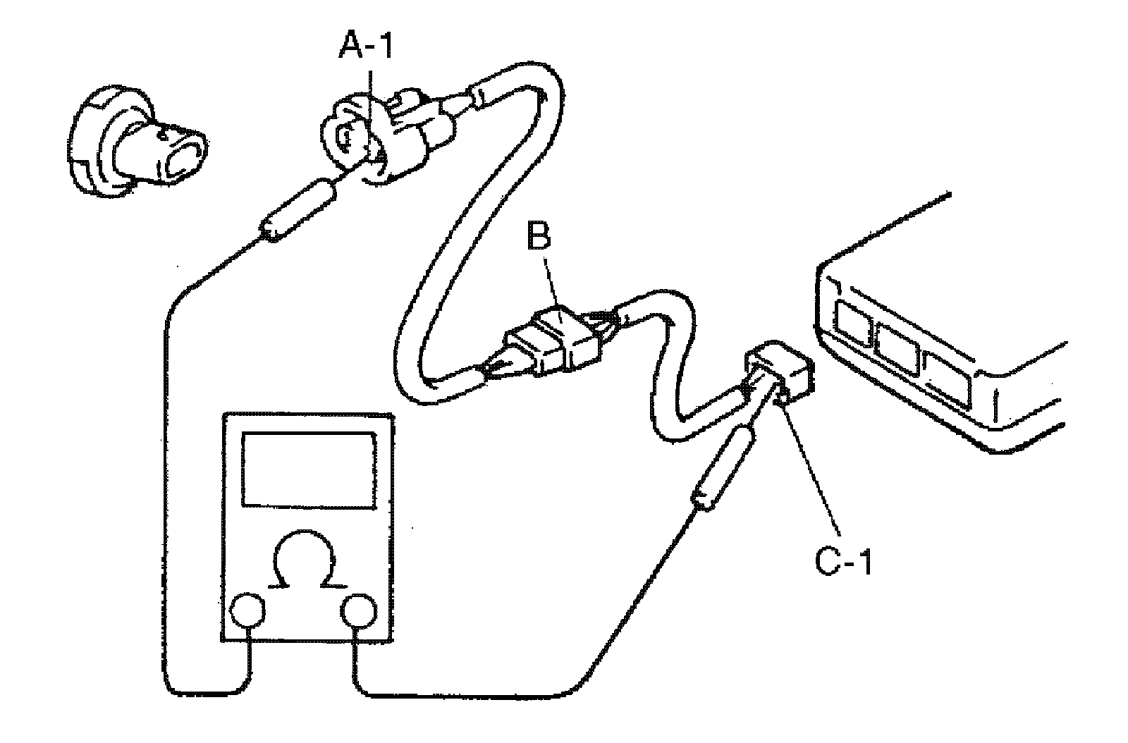 2. Disconnect the connector included in the circuit (connector-B in the figure) and measure resistance between terminals "A-1" and "B-1". If no continuity is indicated, that means that the circuit is open between terminals "A-1" and "B-1". If continuity is indicated, there is an open circuit between terminals "B-1" and "C-1" or an abnormality in connector-B.