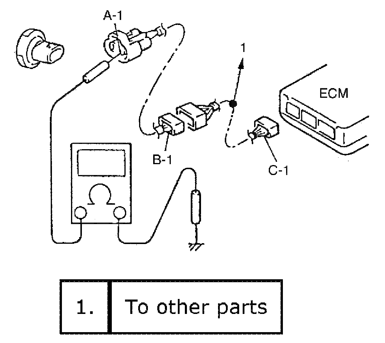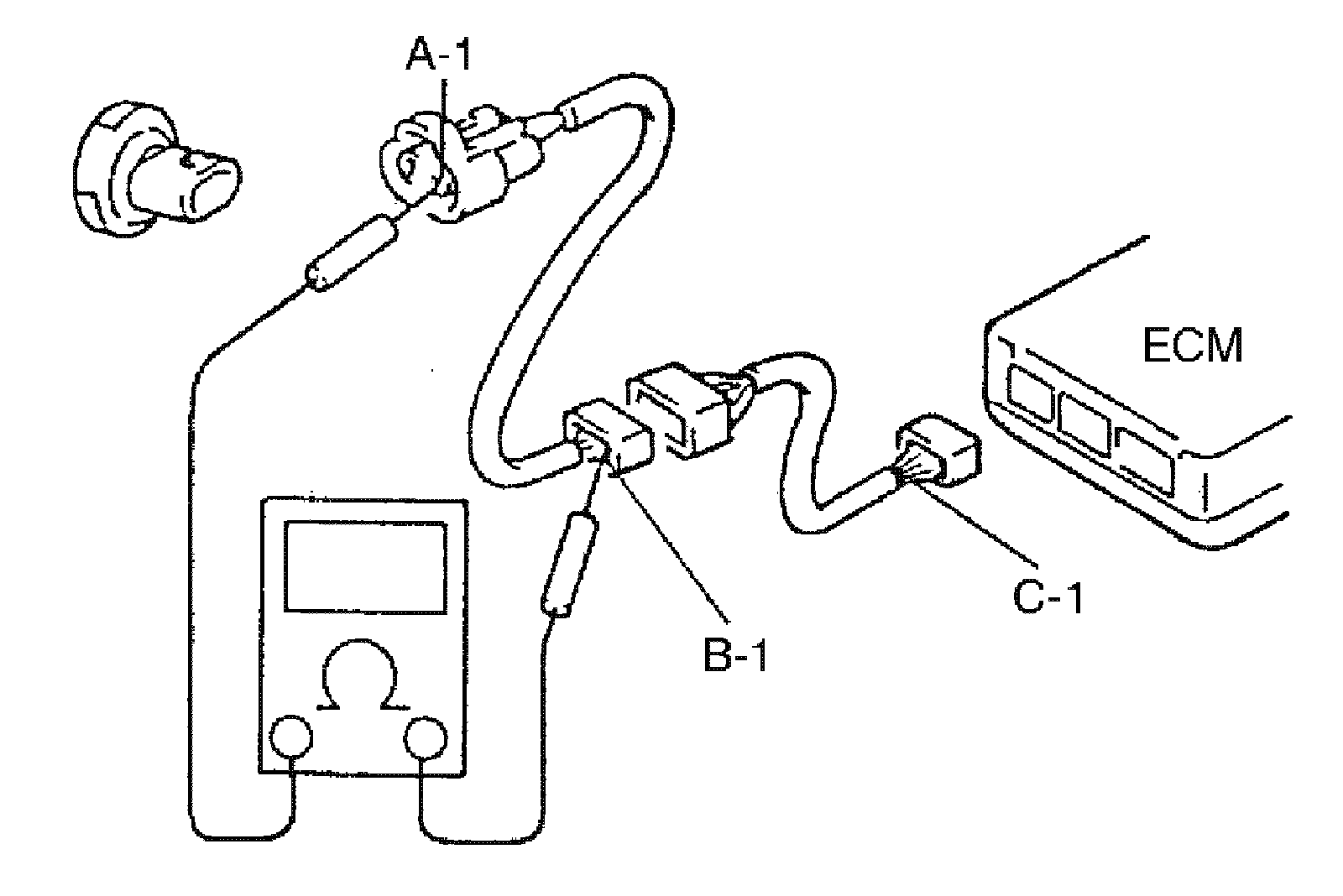 1. Measure resistance between connector terminals at both ends of the circuit being checked (between "A-1" and "C-1" in the figure). If no continuity is indicated (infinity or over limit), that means that the circuit is open between terminals "A-1" and "C-1".