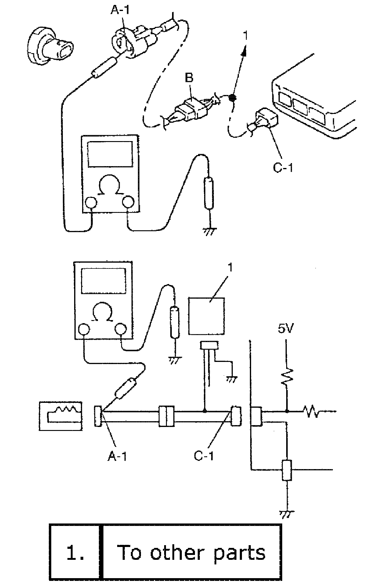 b. Also, if measured values were as listed below, it means that there is a resistance (abnormality) of such level that corresponds to the voltage drop in the circuit between terminals "A-1" and "B-1".
