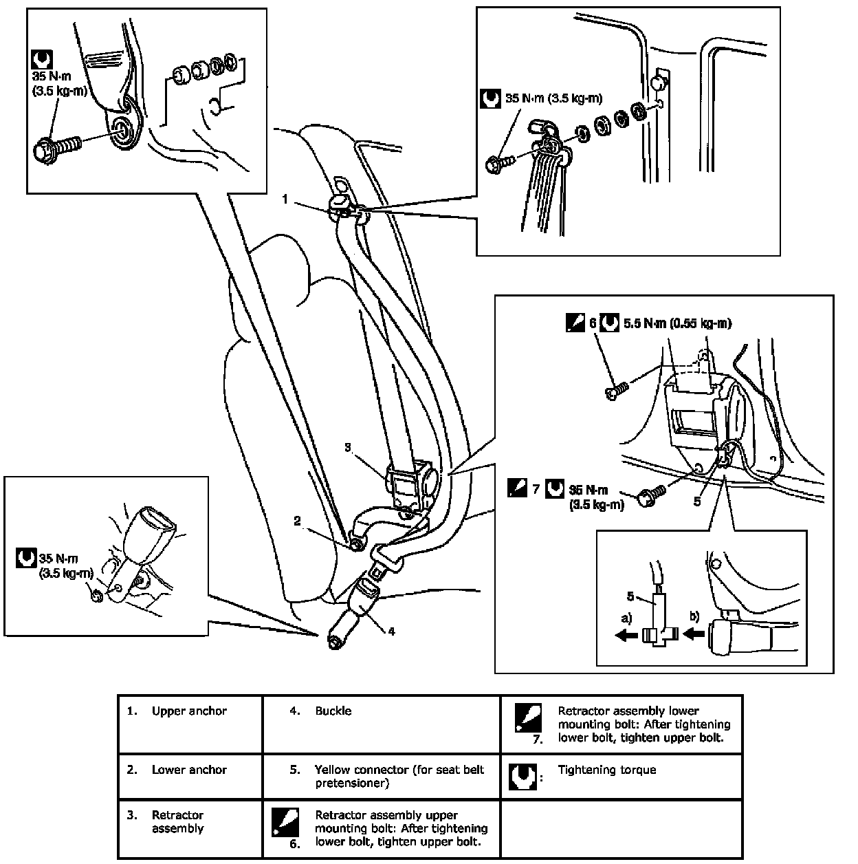 - Be sure to read Precautions on Service and Diagnosis of Seat Belt before starting to work and observe every precaution during work. Neglecting them may result in personal injury or unactivation of the seat belt pretensioner when necessary.