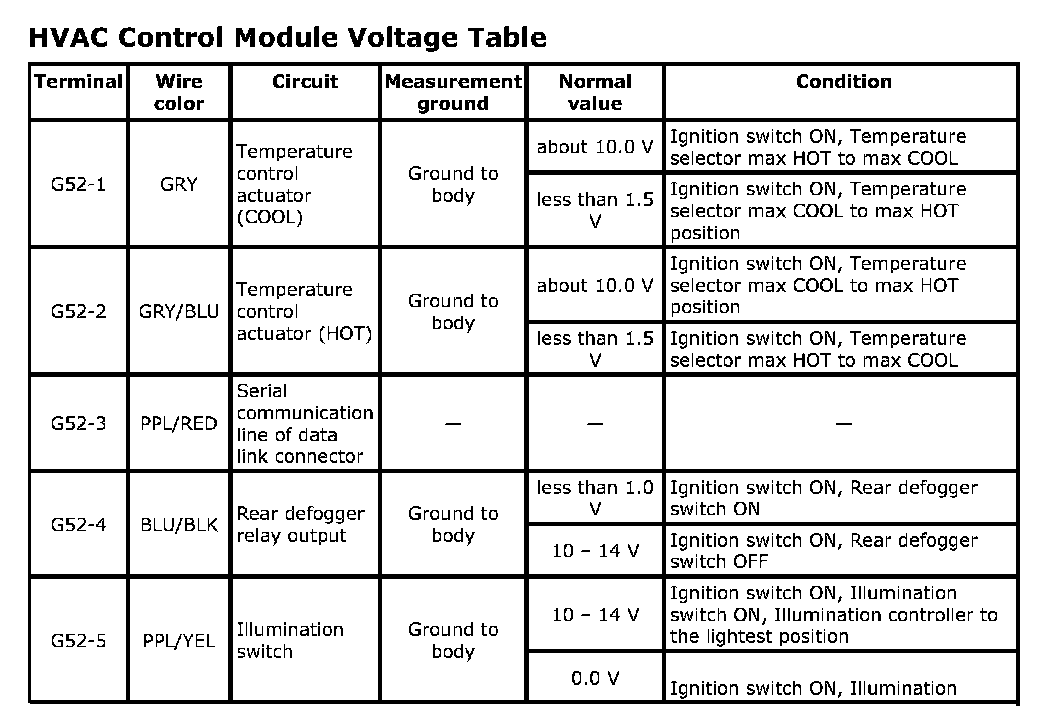 3. Check each terminal voltage with couplers connected by referring to HVAC Control Module Voltage Table.