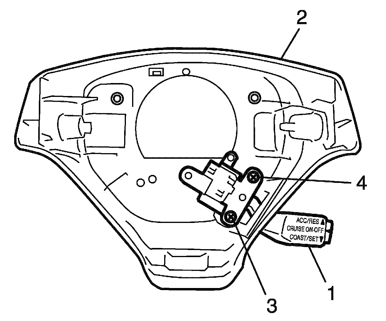 4. Remove cruise control lever (1) from steering wheel lower cover (2) removing cruise control lever bolt (3) and cruise control lever screw (4).