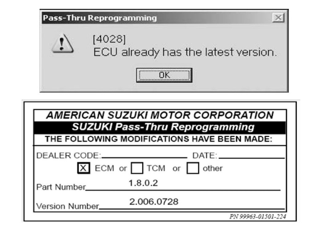 3. If an error screen appears A028 ECU already has latest version" appears, the ECU already has the most current calibration. If there is no glove box label indicating the current calibration, write in the Pass-Thru version and Database version on the Reprogram Label P/N 99963-01501-224