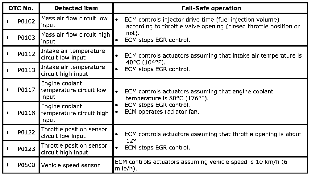 When any of the given DTCs is detected, ECM enters fail-safe mode as long as malfunction continues to exist but that mode is canceled when ECM detects normal condition after that.