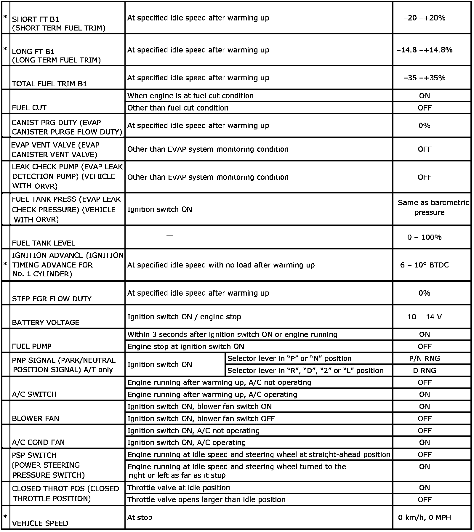 Scan Tool DataAs the data values are standard values estimated on the basis of values obtained from the normally operating vehicles by using a scan tool, use them as reference values. Even when the vehicle is in good condition, there may be cases where the checked value does not fall within each specified data range. Therefore, judgment as abnormal should not be made by checking with these data alone.