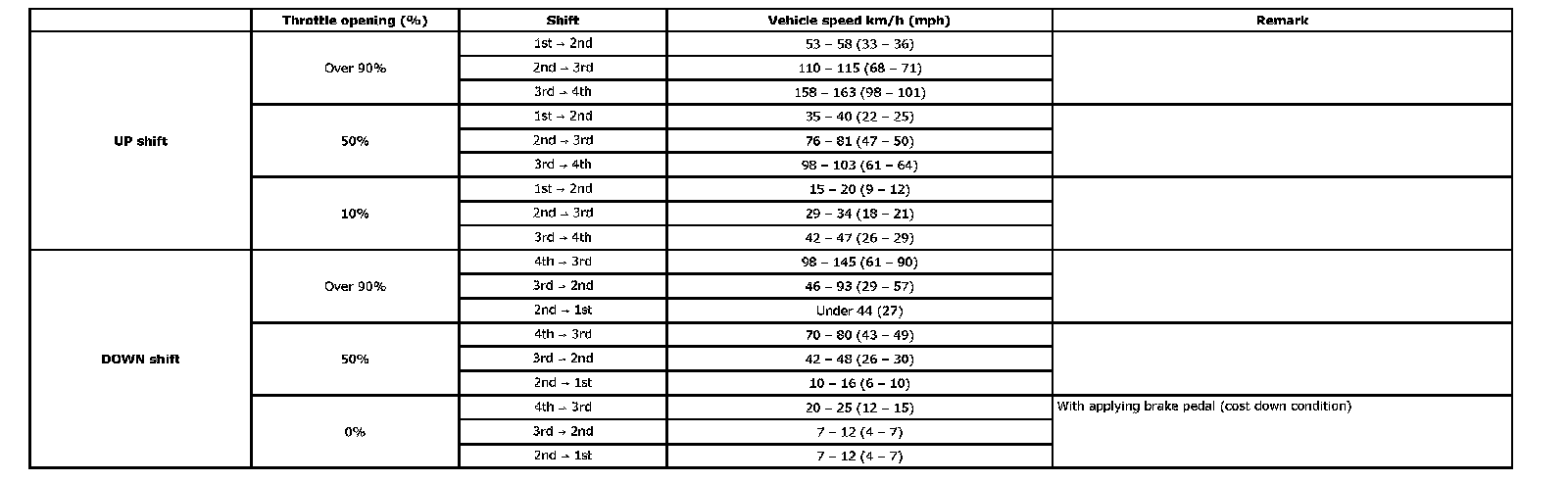 Automatic Gear Shift Table (for 2WD Model)Automatic gear shift schedule is shown in the following table. Test-drive the vehicle on a flat road in the D position.