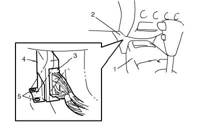 3. Remove parking brake cover, console box (1) and console covers (2).