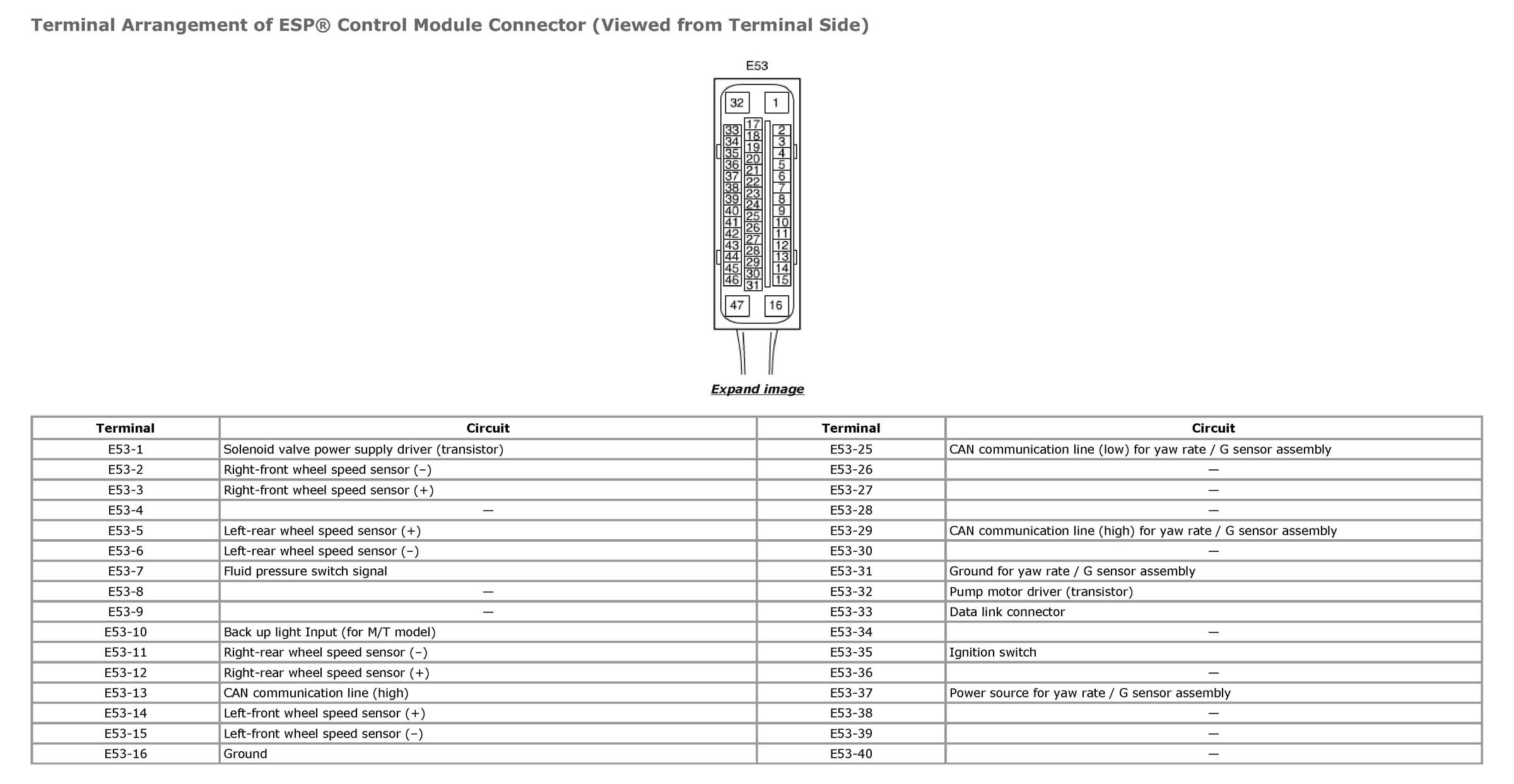 Terminal Arrangement of ESP(R) Control Module Connector (Viewed from Terminal Side)