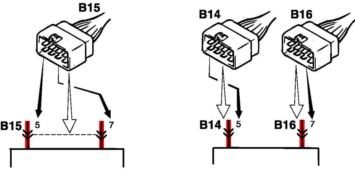 3. Terminals in one connector (Broken line) (B15)/Terminals in different connectors (B14, B16)