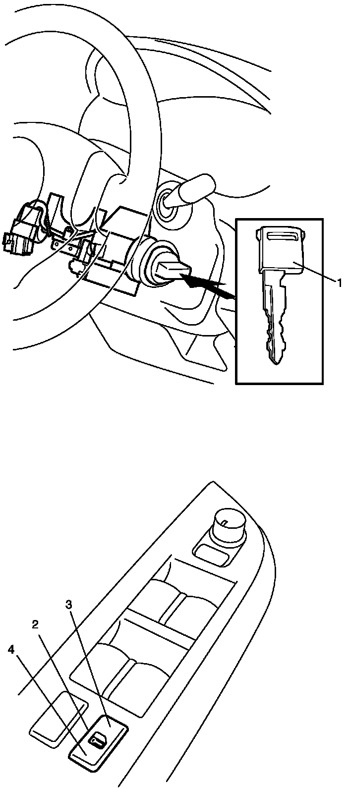 3. Insert ignition key (1) into ignition key cylinder.