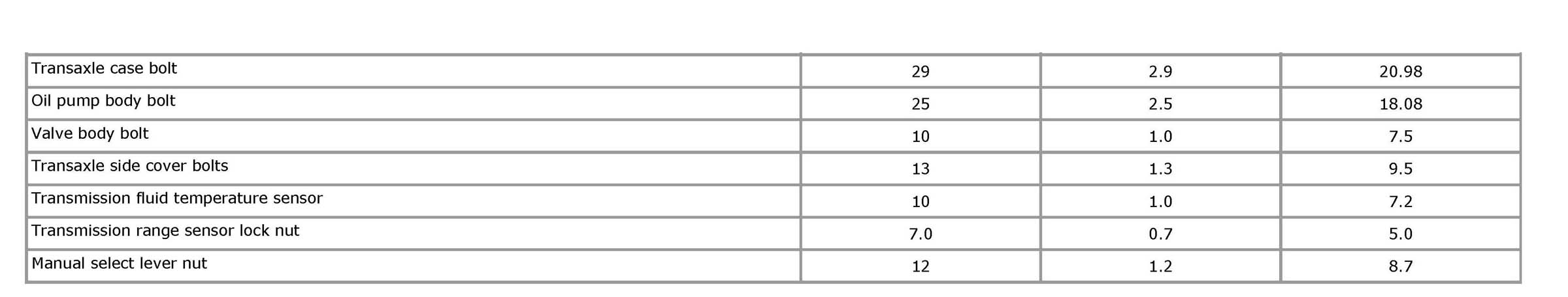 Home >> Suzuki >> 2007 >> SX4 4WD L4-2.0L >> Repair and Diagnosis >> Specifications >> Mechanical Specifications >> Automatic Transmission/Transaxle >> Torque Specifications