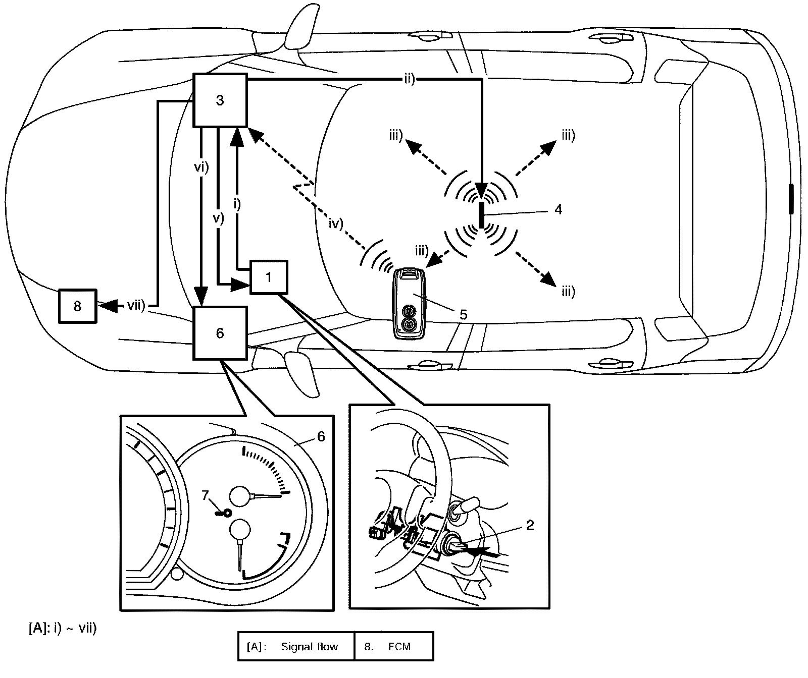 When the ignition knob switch (2) installed to the steering lock unit (1) is pushed, the keyless start control module (3) activates the center antenna (4) to send out the request signal in the vehicle compartment. When the remote controller (5) receives the request signal from the center antenna, it transmits the ID code to the keyless start control module. The keyless start control module compares the ID code sent by the remote controller with the ID code registered in the keyless start control module. When these ID codes match, the keyless start control module makes the key indicator light (7) in the combination meter (6) light in blue and unlocks the steering lock unit to enable the ignition knob switch to turn. When the ignition knob switch is turned to ON position in this state, ID codes of ECM and keyless start control module are compared through CAN communication (immobilizer function). When they match, turning the ignition knob switch to start position will start the engine.