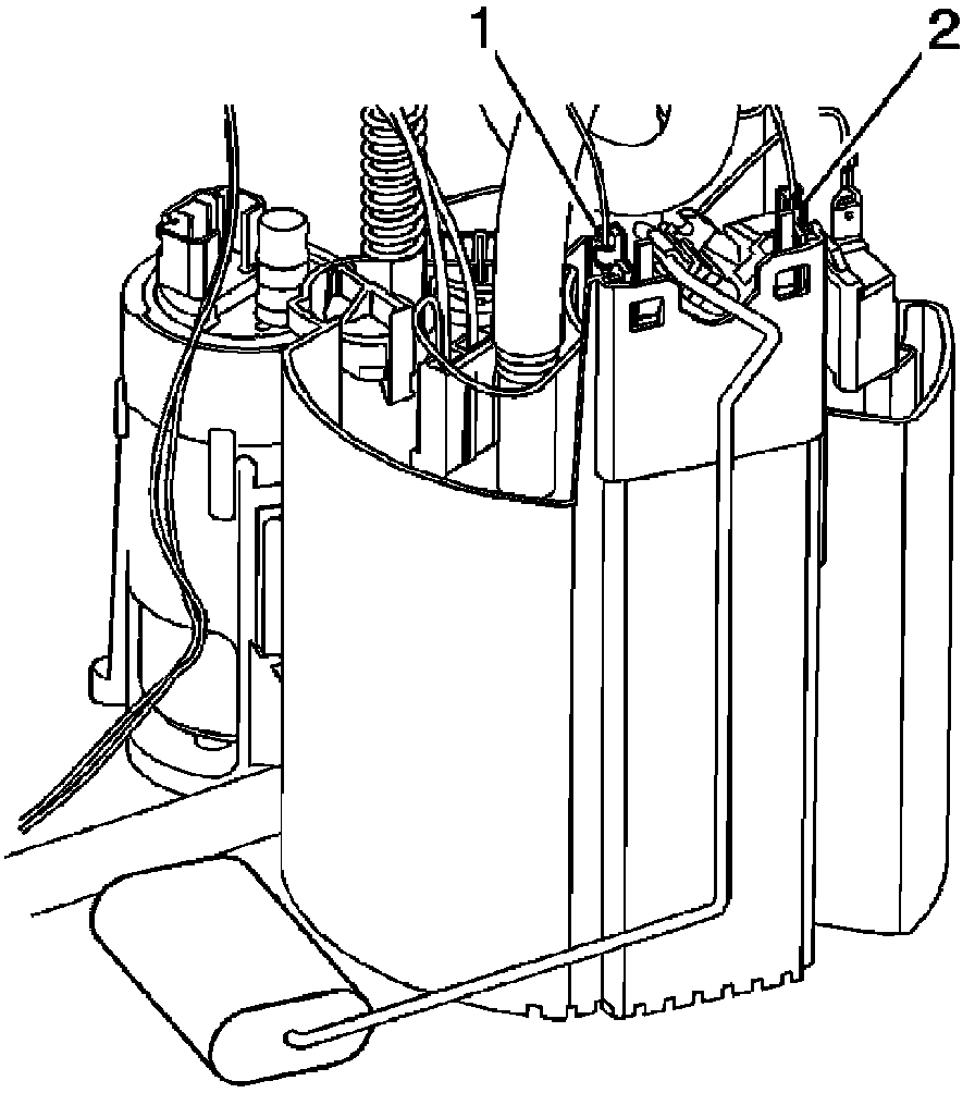 1. Install the fuel level sender unit and float onto the fuel pump module. Make sure that the sender cap snaps into place (1, 2).