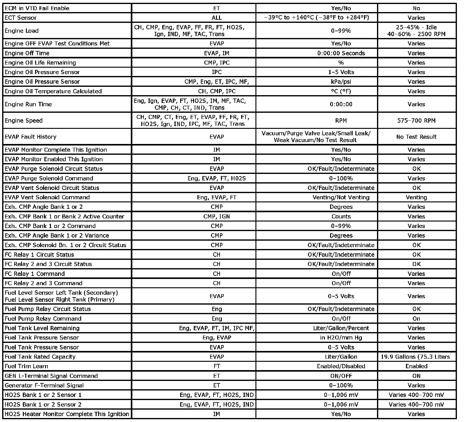 Scan tool values from an engine that is operating correctly may be used for comparison with the engine you are diagnosing. The Engine Scan Tool Data List represents the values that would be seen on a normal operating engine.