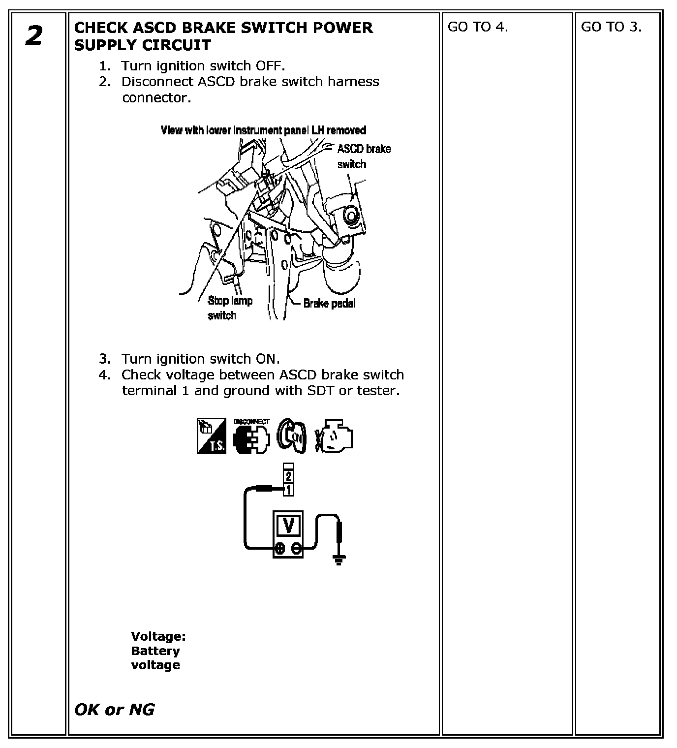 If NG, adjust ASCD brake switch installation and perform step 3 again.