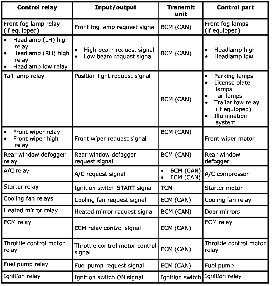 Relay Control System: System DescriptionIPDM E/R activates the internal control circuit to perform the relay ON-OFF control according to the input signals from various sensors and the request signals received from control units via CAN communication.