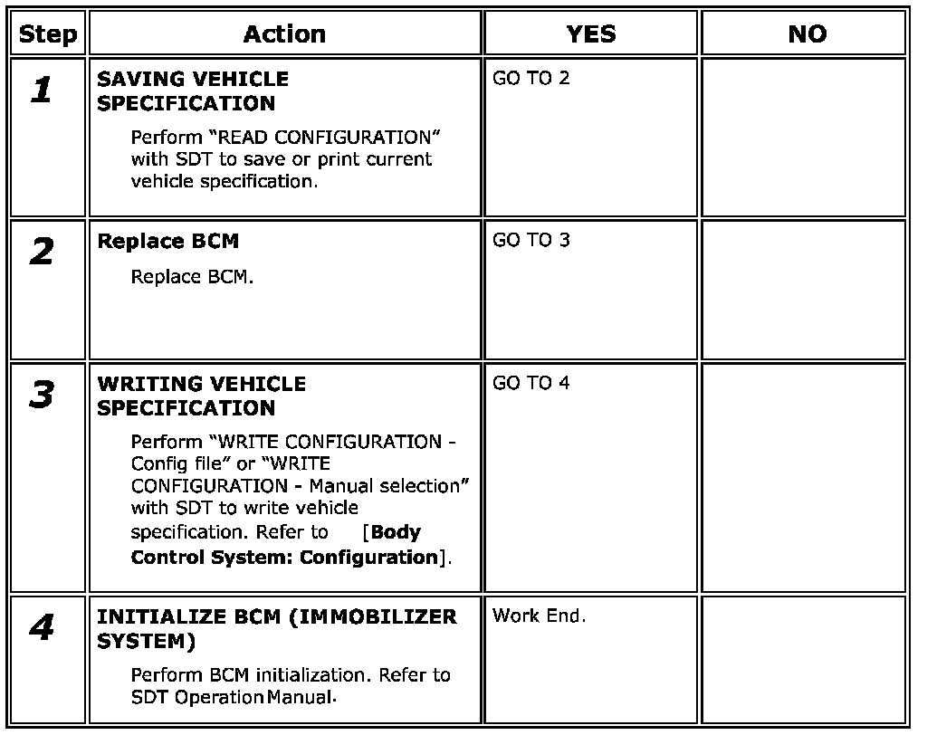 - When replacing BCM, you must perform WRITE CONFIGURATION with SDT.