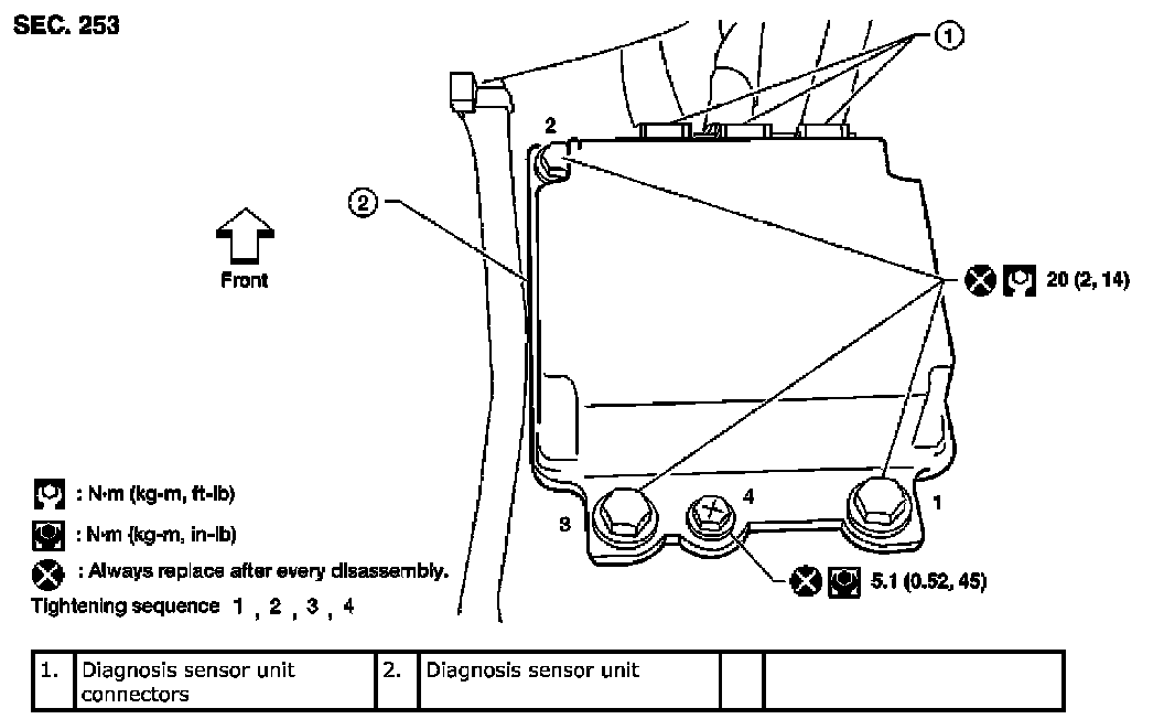 After replacing the diagnosis sensor unit, confirm that the diagnosis sensor unit identification is correct for the vehicle as equipped. Refer to [SDT Function (Airbag)].