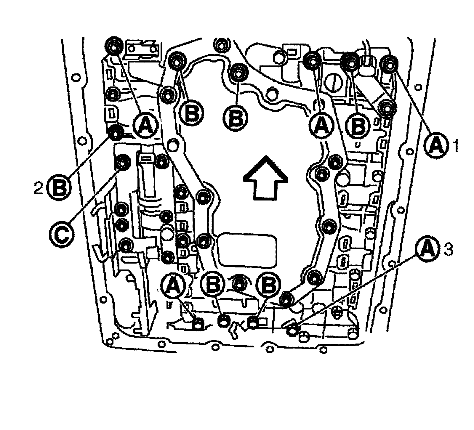 8) Install bolts (A), (B) and (C) in control valve with TCM. Tighten bolt (1), (2) and (3) temporarily to prevent dislocation. After that tighten them in order (1 -> 2 -> 3). Then tighten other bolts. Tighten control valve with TCM bolts to the specified torque.
