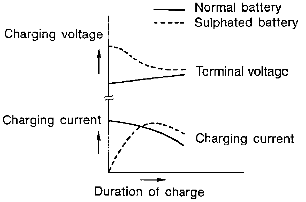 To determine if a battery has been "sulphated", note its voltage and current when charging it. As shown in the figure, less current and higher voltage are observed in the initial stage of charging sulphated batteries.