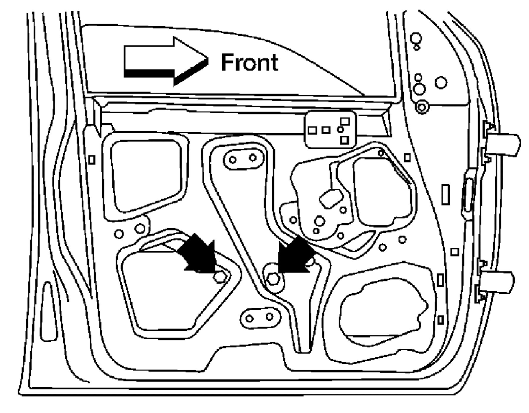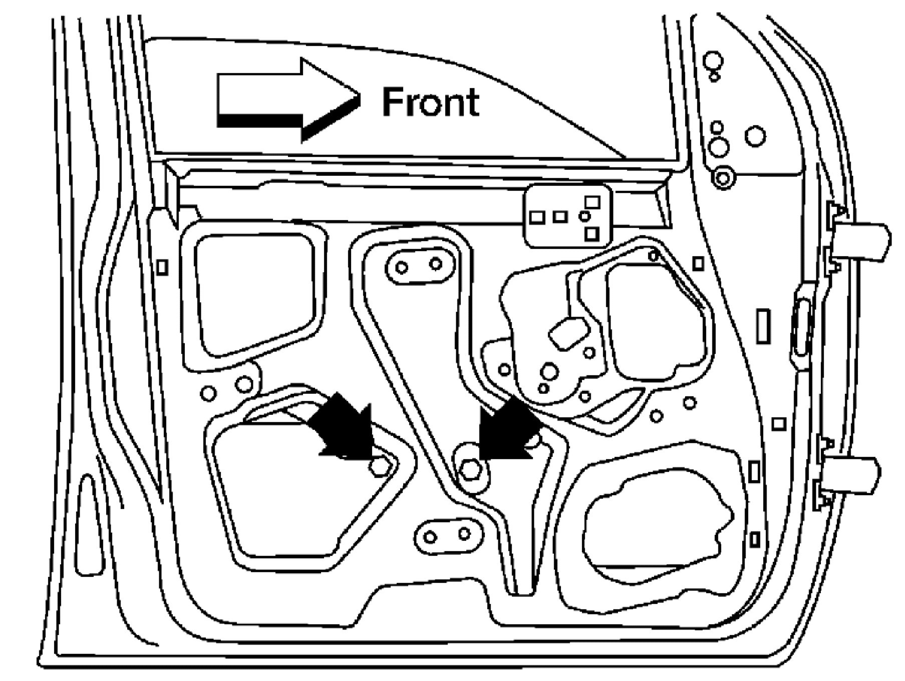 a. Loosely install the top rear regulator bolt to use along with the temporary holds on the window motor or crank assembly to install the assembly in the door.