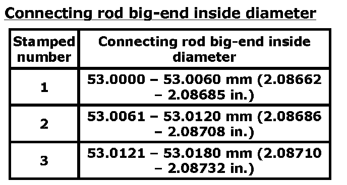 Piston pin clearance in connecting rod small-endStandard: 0.003 - 0.017 mm (0.0002 - 0.0006 in.)