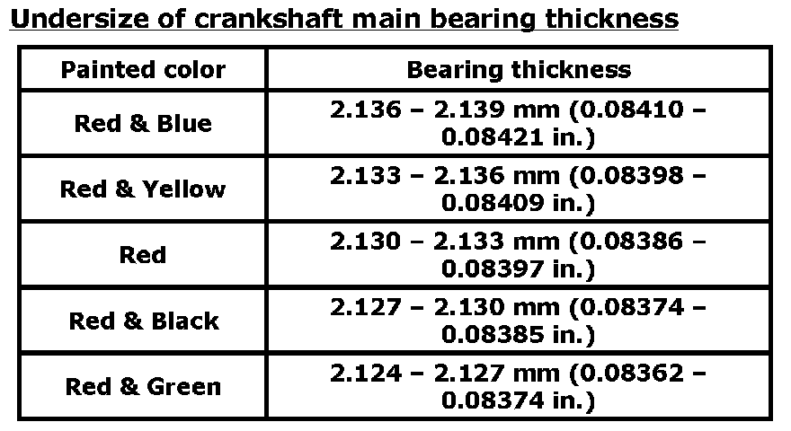 Stamped number for crankshaft journal diameter is "4", and stamped alphabet for cylinder block journal inside diameter is "A". Standard: 0.019 - 0.031 mm (0.00075 - 0.00122 in.)