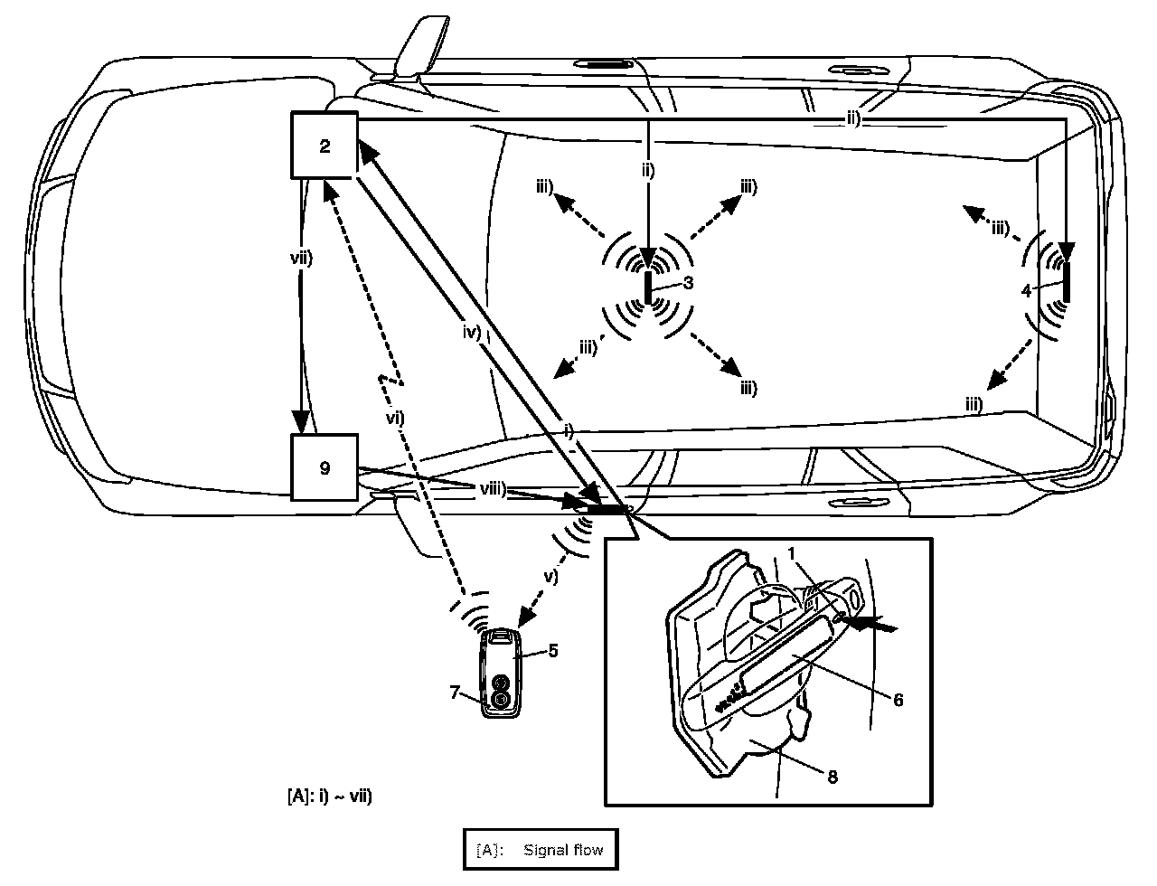 Description of Keyless Start System Door Lock FunctionWhen the request switch (1) incorporated in the outside handle of the driver side door, front passenger side door or rear end door is pushed, the keyless start control module (2) activates the center antenna (3) and luggage room antenna (4) to send out the radio wave in the vehicle compartment to check if the remote controller (5) is in the vehicle compartment or not. When the keyless start control module receives no signal from the remote controller (i.e., the remote controller does not exist in the vehicle compartment), it activates the antenna (6) of the door of which the request switch has been pushed to send the request signal out of the compartment. If the remote controller exists within the door lock operation area, it receives the request signal sent from the above said antenna, sends the ID code of the remote controller and the request signal to the keyless start control module and at the same time, it makes the operation indicator light (7) of the remote controller light up. Lighting of the operation indicator light indicates that the remote controller sent the ID code and the request signal.