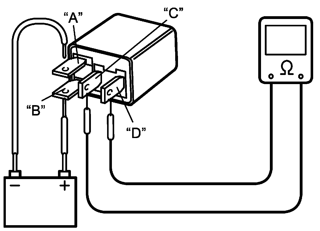 4. Connect battery positive (+) terminal to terminal "B" of relay. Connect battery negative (-) terminal to terminal "A" of relay. Check for continuity between terminal "C" and "D". If there is no continuity when relay is connected to the battery, replace defective relay.