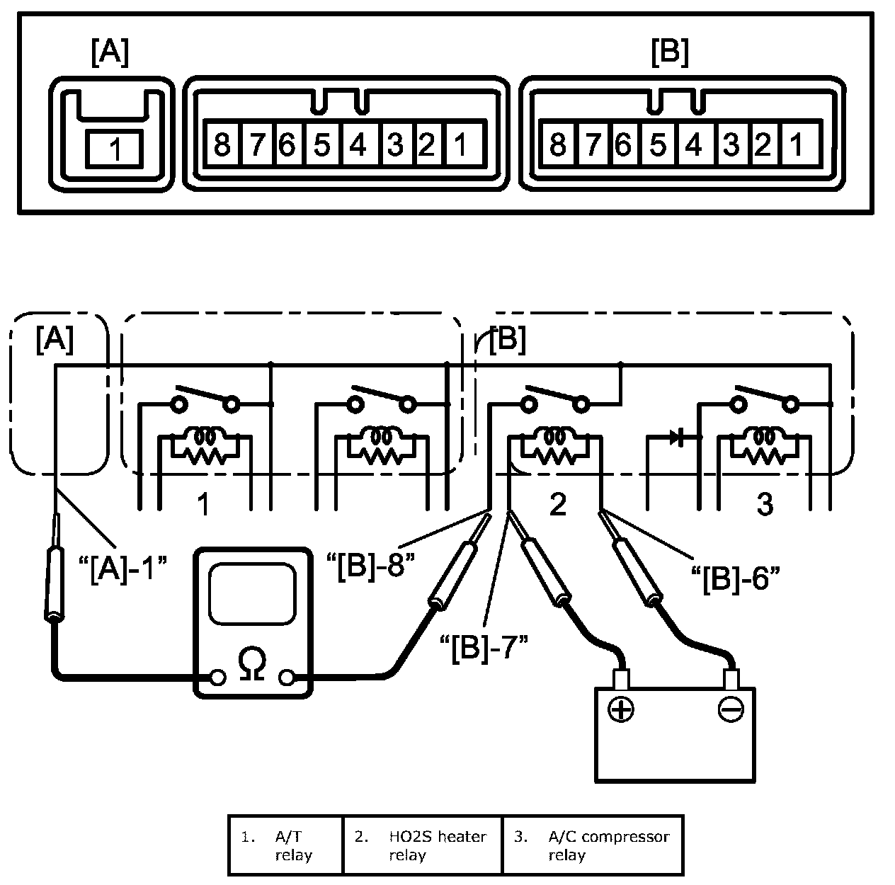 3. Check that there is no continuity between terminals "[A]-1" and "[B]-8" of relay. If there is continuity, replace relay.