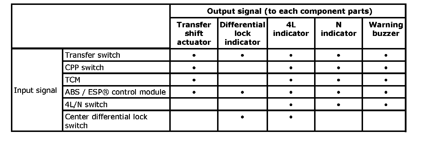 4WD control module outputs the following signals to actuators, indicators, warning buzzer, according to the transfer switch operation.