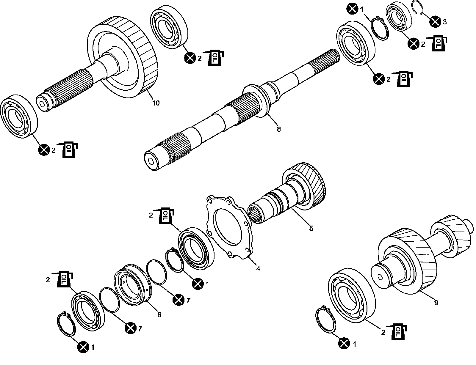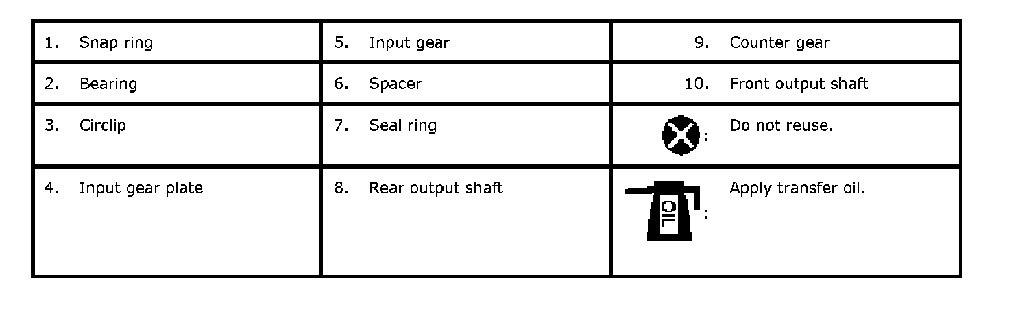 Input Gear Assembly, Counter Gear Assembly, Front Output Shaft Assembly and Rear Output Shaft Assembly Components