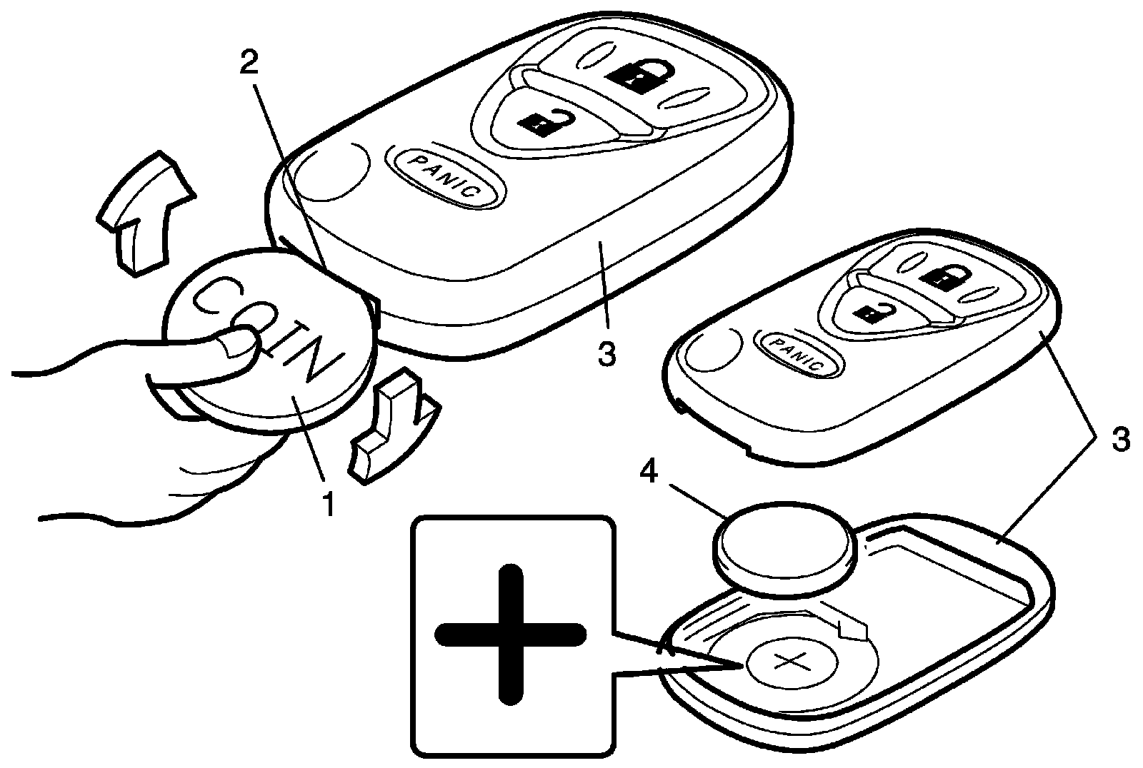 2. Replace the battery (lithium disk-type CR2025 or equivalent) (4) so its "+" terminal faces "+" mark of the transmitter (3).