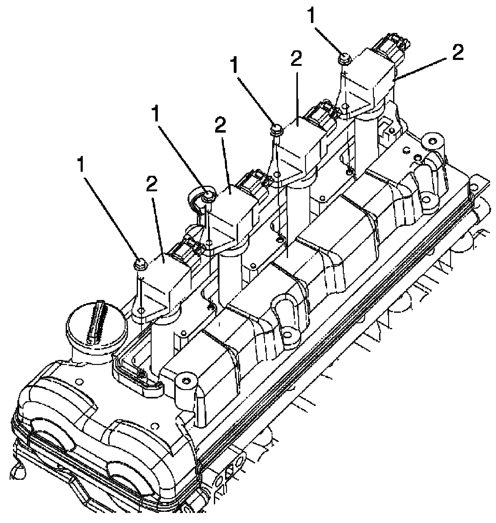 4. Remove ignition coil bolts (1), and then pull out ignition coil assembly (2).
