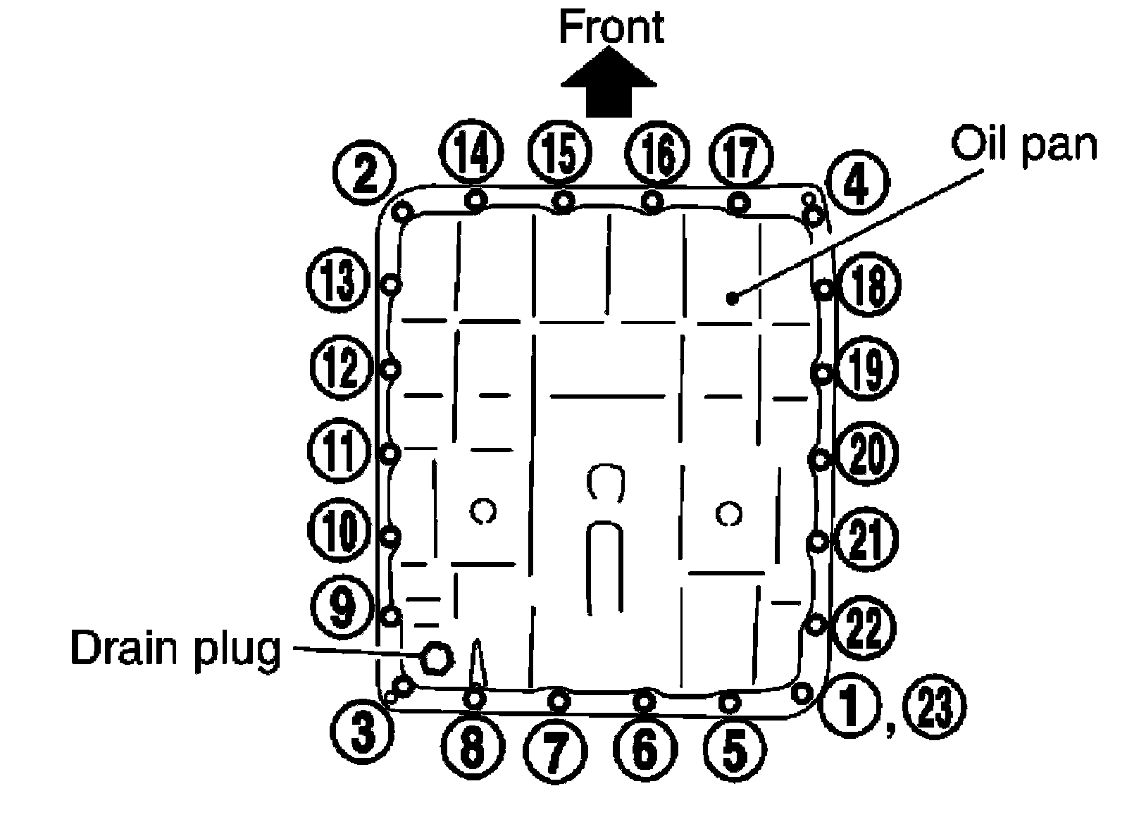Tighten oil pan bolts in numerical order as shown.