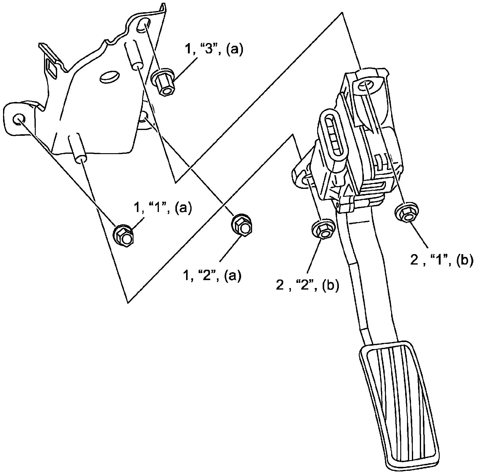 1. Tighten accelerator pedal assembly bracket nuts (1) to specified torque in numerical order ("1" - "3").