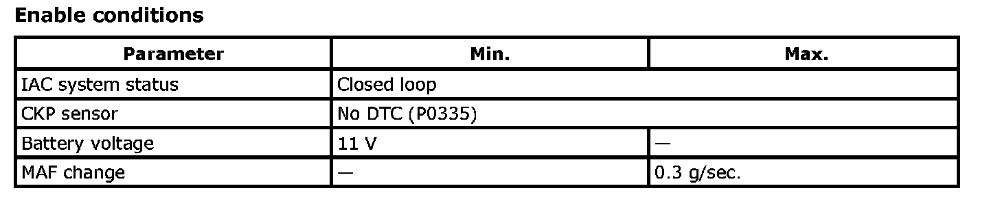 The Idle Air Control (IAC) is functionally checked throttle valve opening by monitoring the closed loop idle speed comparing with the desired idle rpm. If the idle rpm is higher than the desired idle rpm by 200 rpm or lower than the desired idle rpm by 100 rpm, an IAC malfunction is detected. (P0507, P0506)