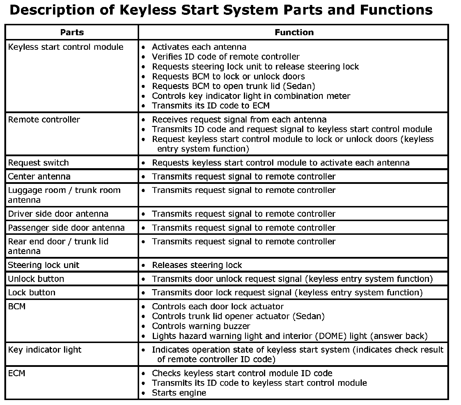 Description Of Keyless Start System Parts and Functions